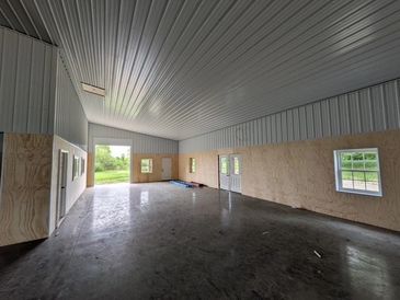The sky's the limit on your interior shop finish. Liner panel, OSB, 3/4 ply-wood, tongue and groove pine, or unfinished, let us know what serves your needs and we'll partner to make it happen.